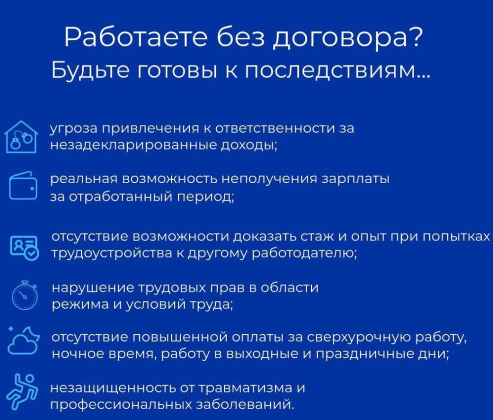 Призываем Вас строго соблюдать трудовое законодательство, проявить социальную ответственность и привести в соответствие трудовые отношения с каждым работником, не подвергая себя риску привлечения к установленной законом ответственности, применения санкций со стороны органов надзора и контроля, задуматься о негативных последствиях и сделать правильный выбор.